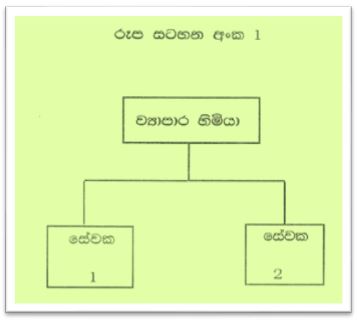 එම සංවිධාන සටහන (organisation chart) මෙසේ දැක්විය හැකිය. අංක 1 දරන රූප සටහනේ පෙන්වන පරිදි ඔහුගේ සේවකයින් දෙදෙනා එකම මට්ටමක වෙයි. ඔවුන් හට වැඩ කටයුතු පැවරීම සහ ඔවුන්ගේ වැඩ කටයුතු සොයා බැලිම සමිපූර්ණයෙන්ම ව්යාපාරිකයා සතු වෙයි. ඔවුන් තිදෙනා අතර ඇති ව්යාපාරයේ කටයුතු කිරීම සඳහා ගොඩනැගෙන අන්තර්සම්බන්ධතාවය ව්යාපාරයේ කාර්යක්ෂමතාවයේ මුල්ගල වශයෙන් හැඳින්විය හැකිය.