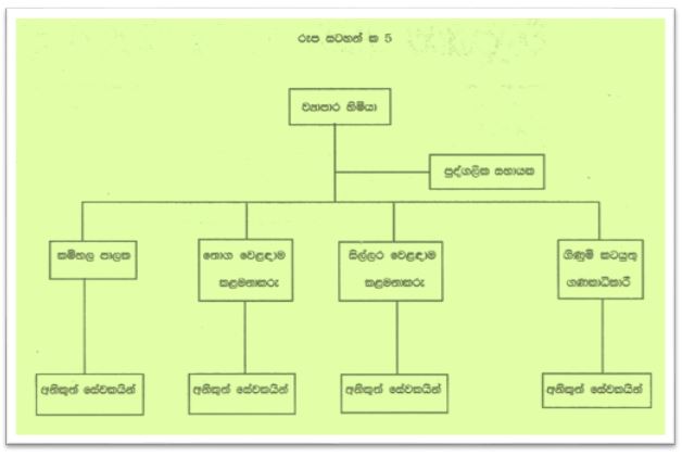 ඔහුගේ නව නිෂ්පාදන කාර්යය තේරුමි ගැනිමේ පහසුව සඳහා කුඩා වී මෝලකට සිමා කරමු. කාර්යය සංකීර්ණ නොවුවත් ඵයින් නියම ප්රයෝජනය ගැනීම සඳහා එම කාර්යය ගැන මනා දැනුමක් ඇති සේවකයකු සොයාගත යුතුය. ඒ සේවකයා යටතට අවශ්ය අනිකුත්ශ්රේණිවල සේවකයින් පත් කිරිමෙන් පසුව සංවිධාන සටහන අංක 5 රූප සටහනේ දැක්වෙන පරිදි හෝ වෙනත් සුදුසු ආකාරයකට වෙනස් විය හැකිය.