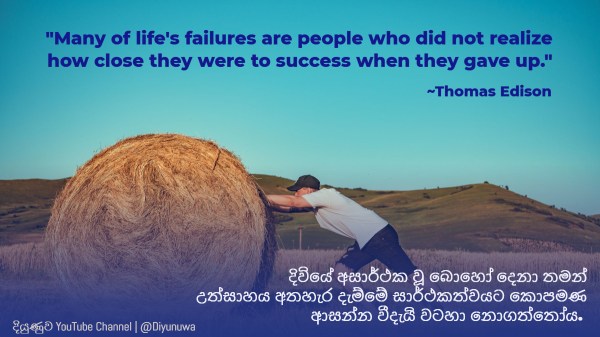 දිවියේ අසාර්ථක වූ බොහෝ දෙනා තමන් උත්සාහය අතහැර දැම්මේ සාර්ථකත්වයට කොපමණ ආසන්න වීදැයි වටහා නොගත්තෝය. Many of life's failures are people who did not realize how close they were to success when they gave up. ~Thomas Edison